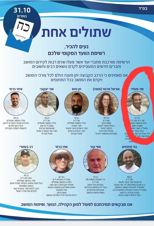 אך כעת אוקטובר 2023 הוא מוצב שוב ברשימת הוועד המקומי של מושב שתולים במועצה האזורית באר טוביה .