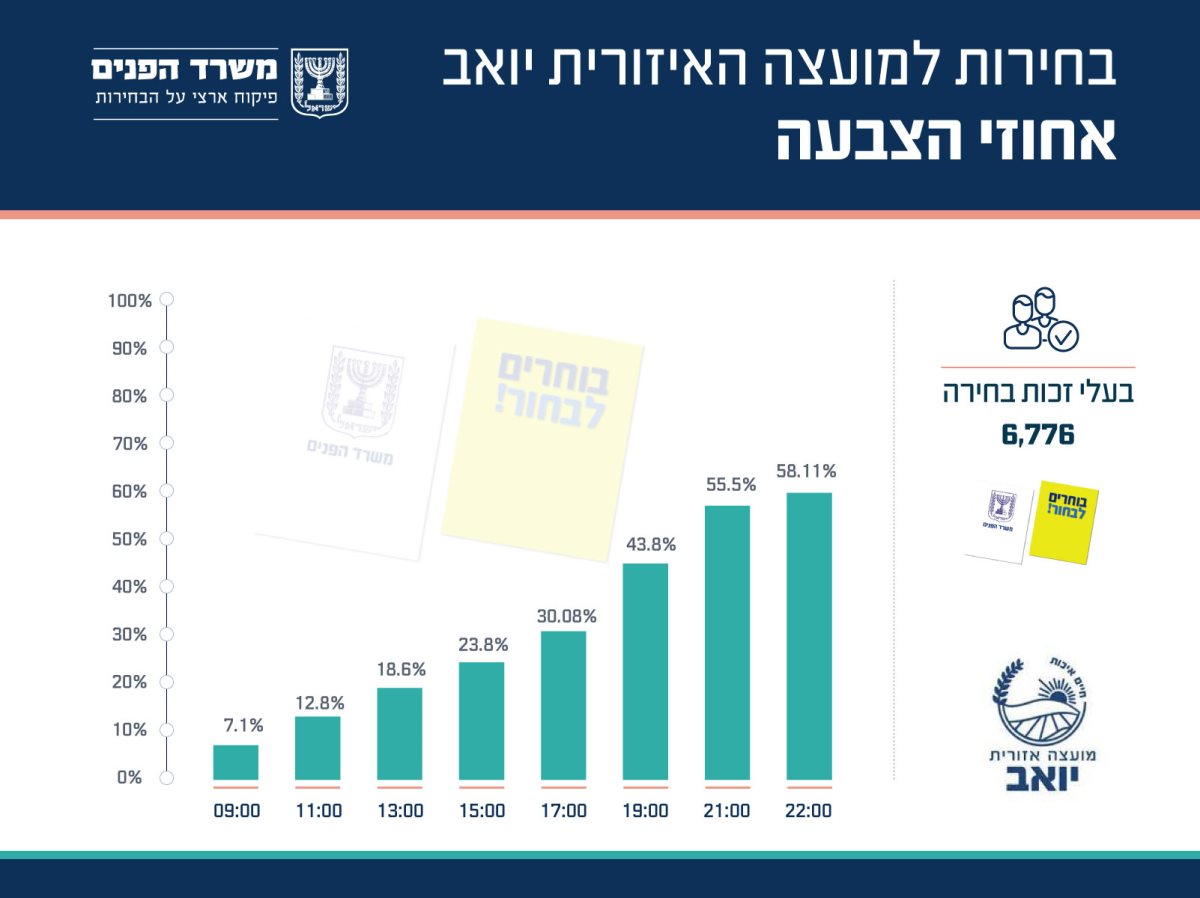 תושבי יואב הצביעו עבור 7 מועמדים (אורית גוטמן, רונן דיגמי, ערן ורדון, נתנאל לרנר, עופר סלע, קידר פינגולד ודוד קוכמן), ב- 15 קלפיות, הכוללות קלפי נגישה מיוחדת שמוקמה ביישוב סגולה.