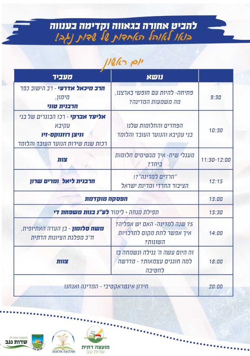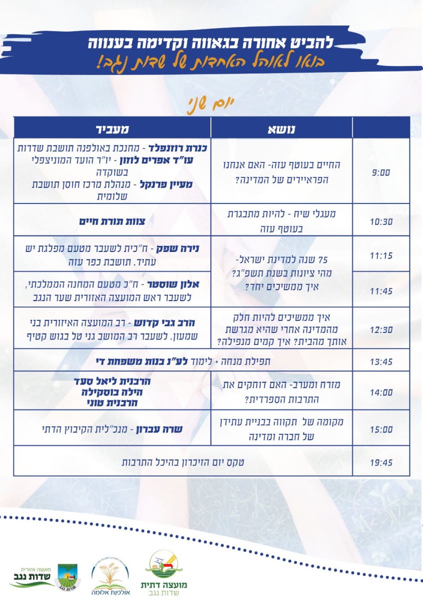 אולפנת אלומה מזמינה את הציבור הרחב למעגלי שיח ולימוד במשך יומיים באוהל האחדות של שדות נגב . ימי ראשון ושני 23.4/24.4 בהשתתפות מוסדות חינוך במועצה ואנשי חינוך.