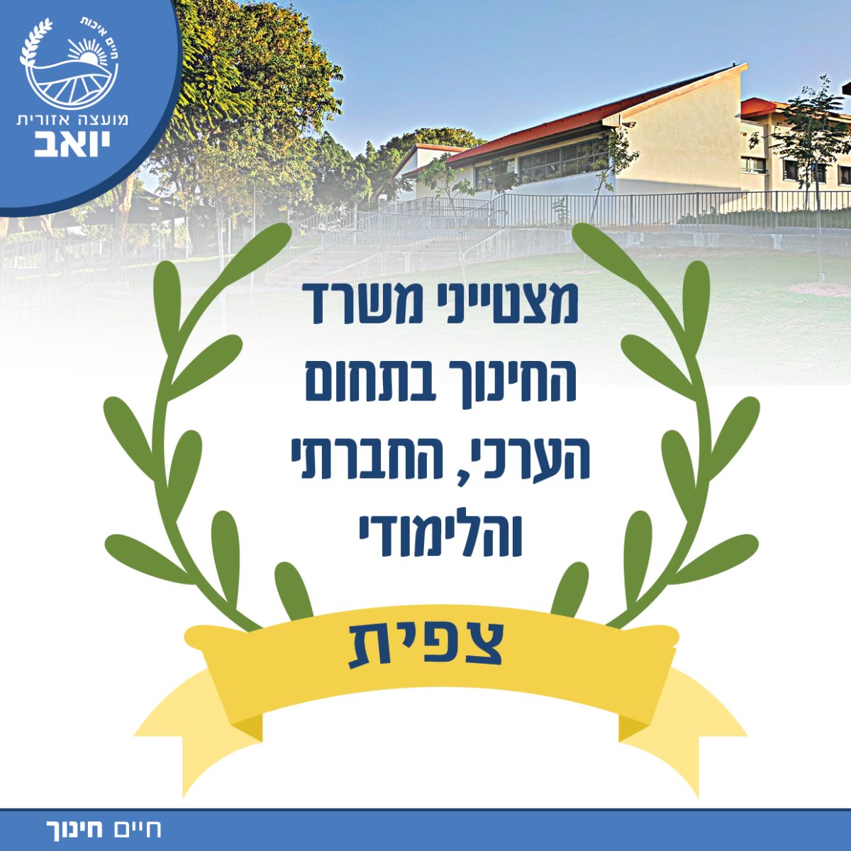 יש לציין כי משרד החינוך פרסם לפני מספר ימים את רשימת בתי הספר המצטיינים לשנת תשפ"ד בתחום הערכי, החברתי והלימודי וממנה עולה כי בית ספר צפית במועצה האזורית יואב בניהולה של נטע פרץ הוא בין המצטיינים בתחומים אלה.