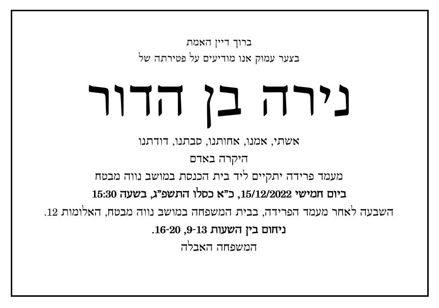 ביום חמישי 15.12 בשעה 15:30 יתקיים טקס פרידה מנירה בסמוך לבית הכנסת במושב נוה מבטח. המשפחה תשב שבעה בביתה ברחוב האלומות 12.