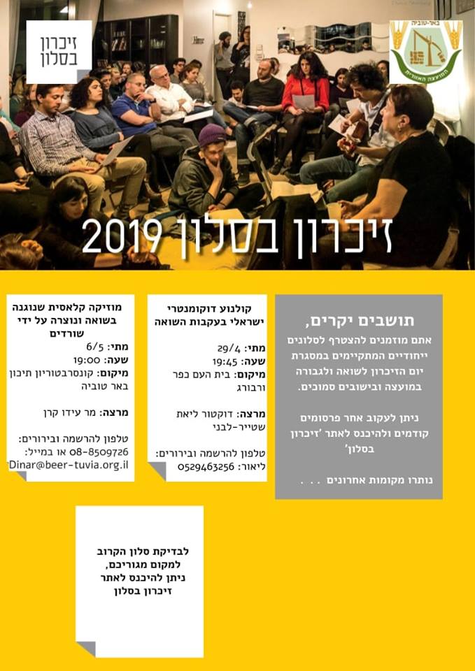 זיכרון בסלון היא יוזמה חברתית המאפשרת לציין את ערב יום השואה בצורה משמעותית, בסלון הבית, בין משפחה וחברים, במפגש המורכב מעדות, חלק אומנותי-שיתופי ודיון. השנה זיכרון בסלון יתקיים במועצה האזורית באר טוביה זוהי הזדמנות לקחת חלק בהנצחת זיכרון השואה ולהשפיע על הקהילה והחברה בישראל.