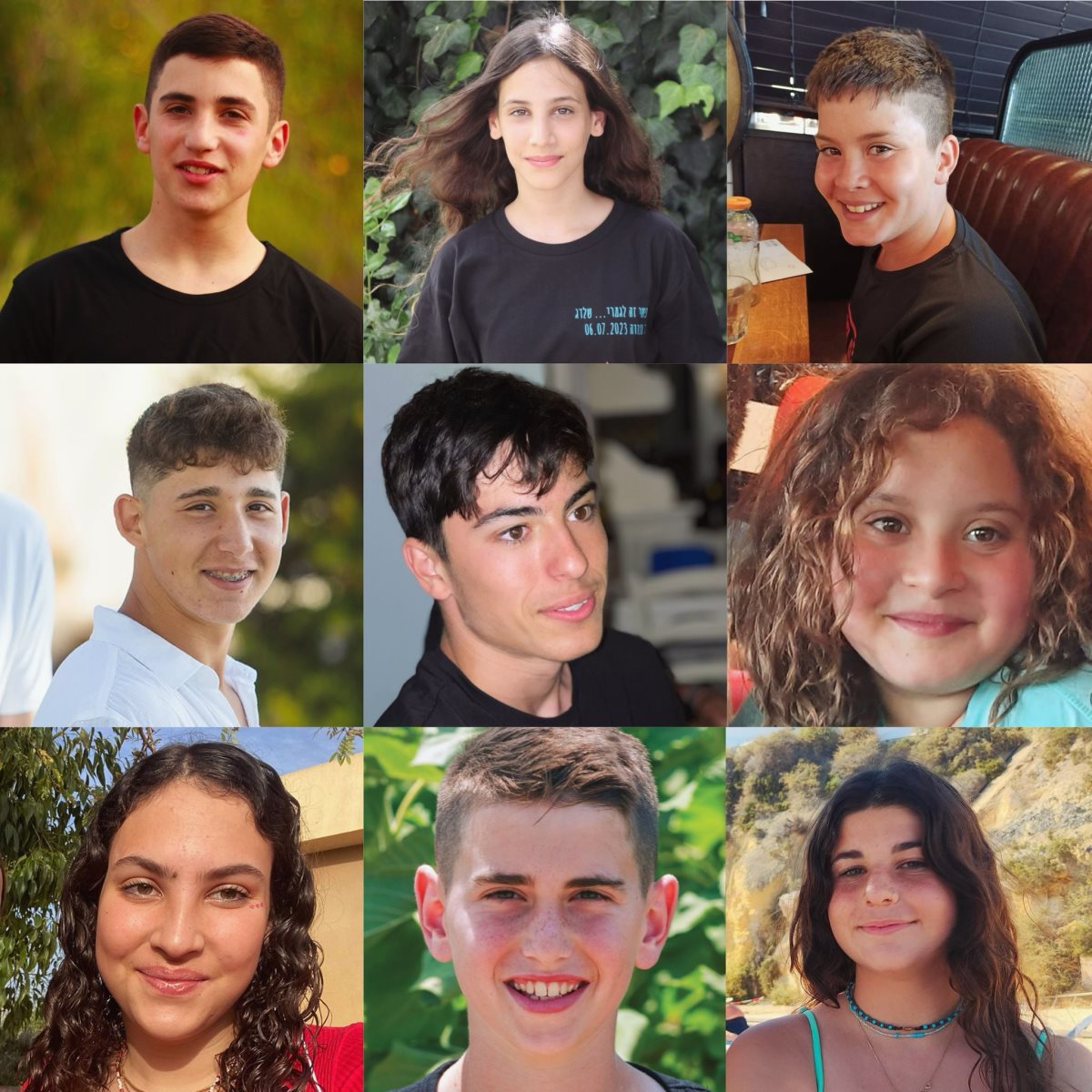 בתמונה: 9 הילדים והנערים שנרצחו בטבח ה7.10, אשר בהמשך הערב הודלקו שמותיהם כתובות אש