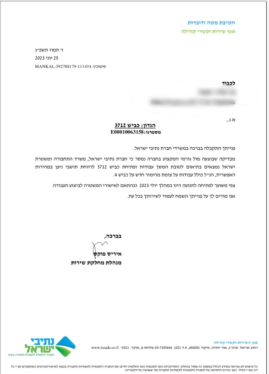 כעת במכתב חדש למערכת יישובניק נט נמסר מנתיבי ישראל בחודש יוני שהעבודות יסתיימו במהלך חודש יולי: