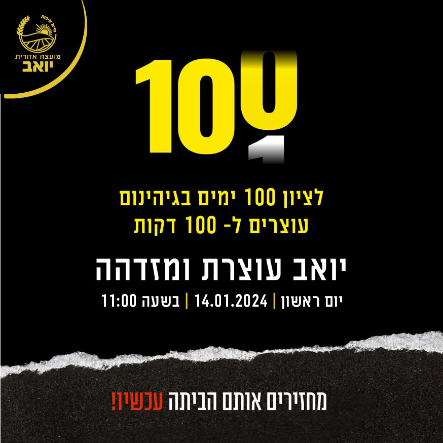 מועצה אזורית יואב מצטרפת לשביתה הסמלית במשק בהשתתפות גופים ציבוריים ועסקיים ותעצור את העבודה ל-100 דקות לציון 100 ימים לשבעה באוקטובר - כהזדהות עם משפחות החטופים, חיילי צה"ל וכוחות המילואים, משפחות המפונים, הפצועים בגוף ובנפש, לזכר הנופלים ולמען אחדות החברה הישראלית.