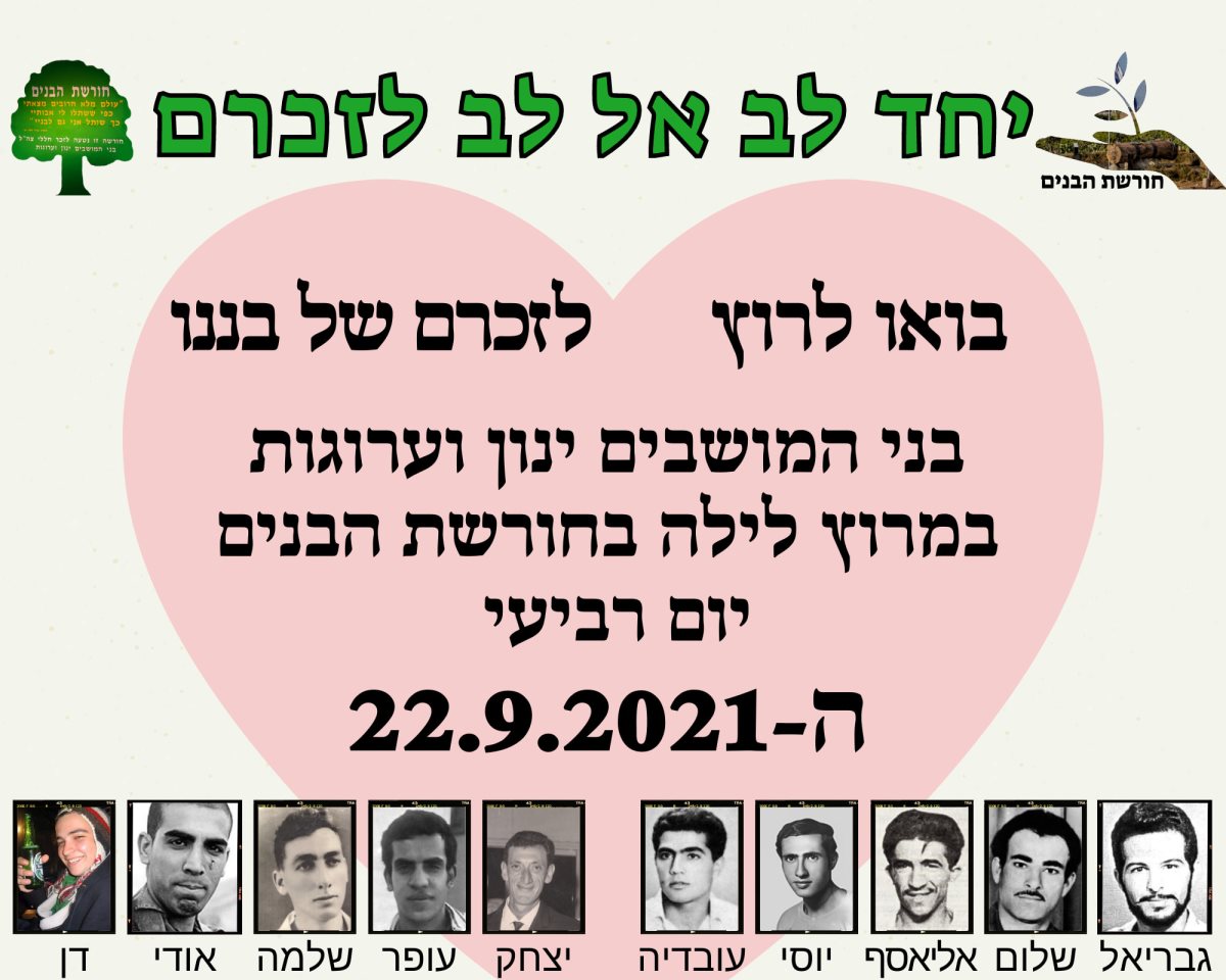 חורשת הבנים הוקמה על המזבלה הישנה של המושבים ומשתרעת על פני 25 דונם, מוטו חורשת הבנים "הנצחה בדרך של חיים". המרוץ פתוח לכל הרצים באשר הם, ובלבד שגילם +16! לכל משתתף אפוד ריצה מקצועי זוהר+ פנס ראש+ ערכה למדידת הזמנים. גביעים יוענקו ל- 3 המקומות הראשונים. פרטי האירוע תאריך: 22/09/2021 כתובת: חורשם הבנים ערוגות