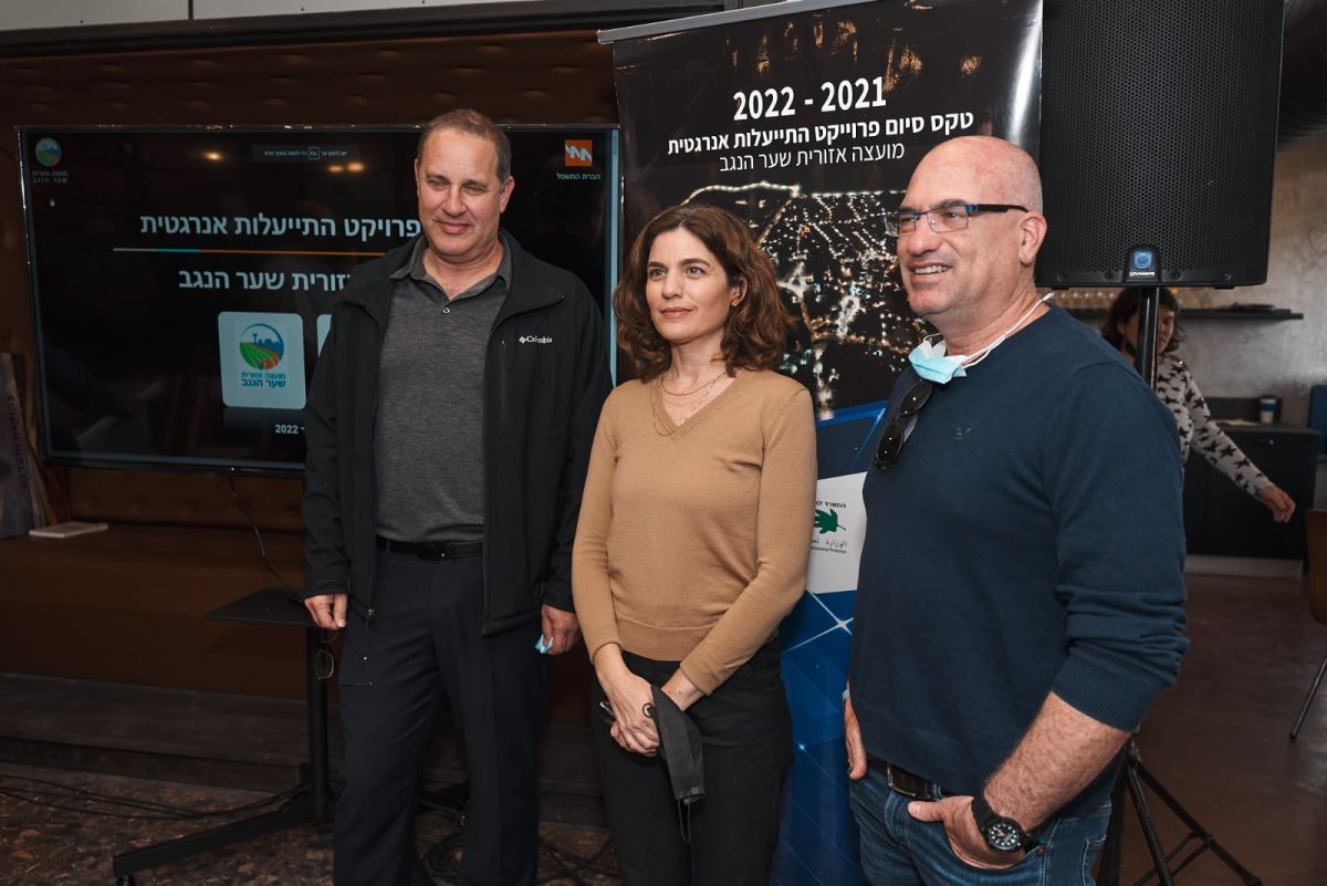 אתמול (ג', 22.2.22 ) התקיים בחממה הטכנולוגית בקיבוץ ניר-עם, טקס לסיום מיזם התייעלות אנרגטית בהובלת חברת החשמל ביישובי המועצה האזורית שער הנגב, בהשתתפות השרה להגנת הסביבה, תמר זנדברג, מנכ"לית המשרד להגנת הסביבה, גלית כהן, אמיר ליבנה, סמנכ"ל אסטרטגיה וחדשנות בחברת החשמל ואופיר ליבשטיין, ראש המועצה האזורית שער הנגב.