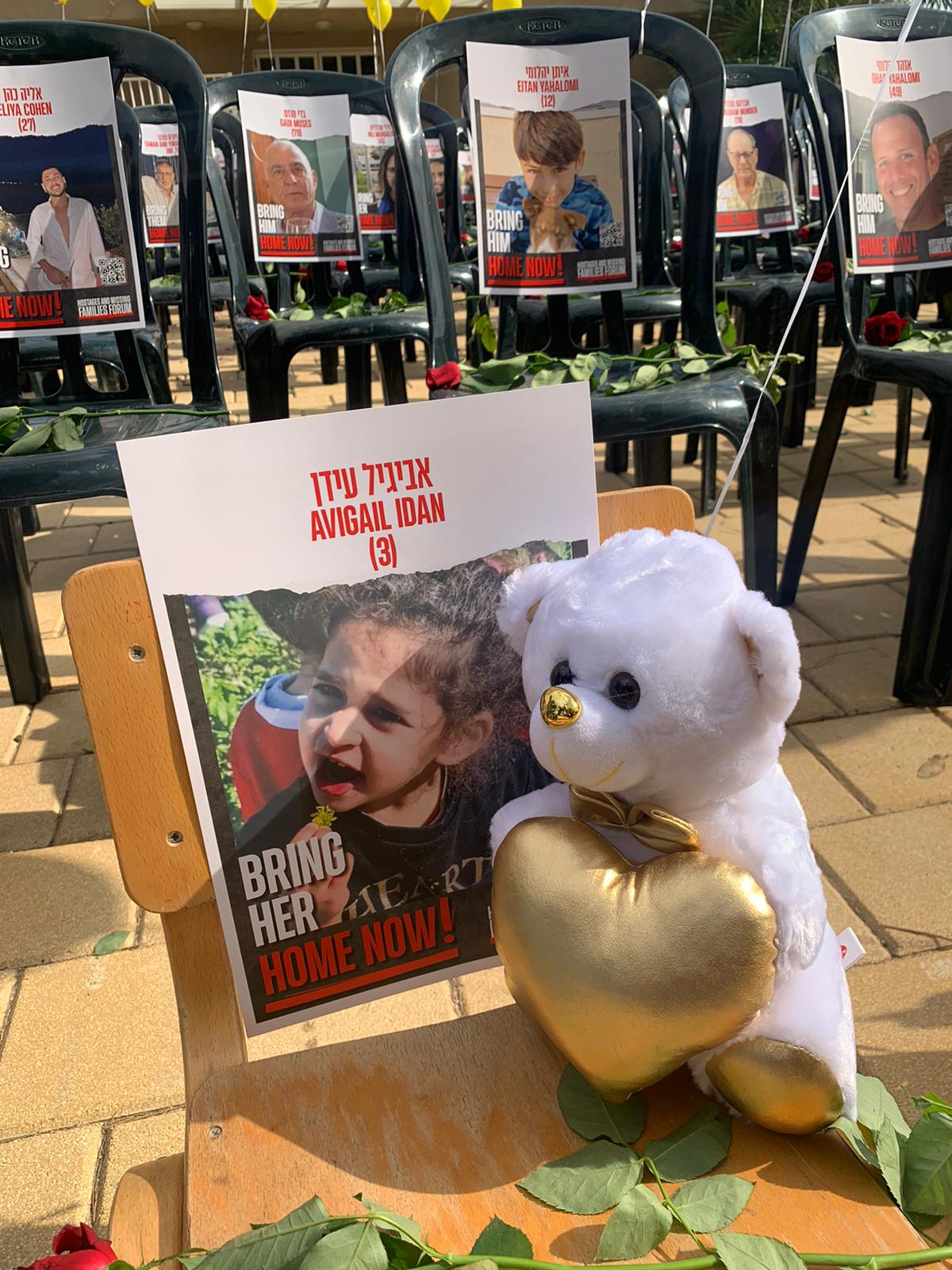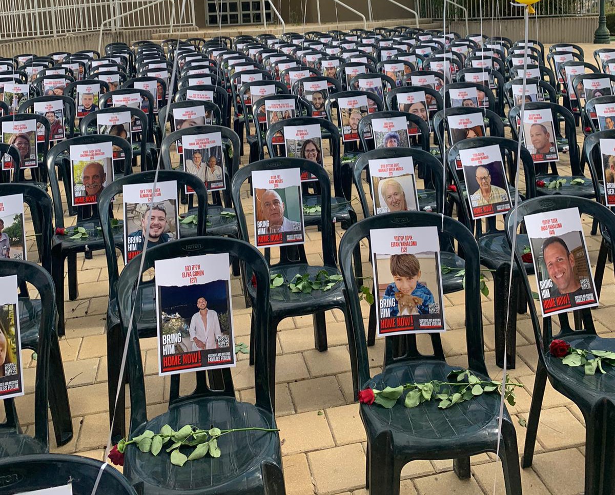 צוות מתנ"ס אזורי לכיש הכין הבוקר (שלישי) מייצג ברחבת המתנ"ס ובו כסאות עם תמונות 240 החטופים שנמצאים בשבי החמאס הקורא להחזרתם. מחכים לשובם.