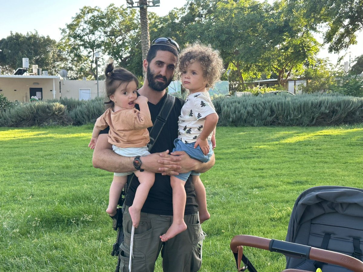 בתמונה: אליה רבש״צ היישוב, שיחד עם חברי כיתת הכוננות הוביל באותה השבת את קו ההגנה ויחד הצילו חיי רבים, ברגע של נחת עם ילדיו שחזרו להתגורר איתו בקיבוץ.