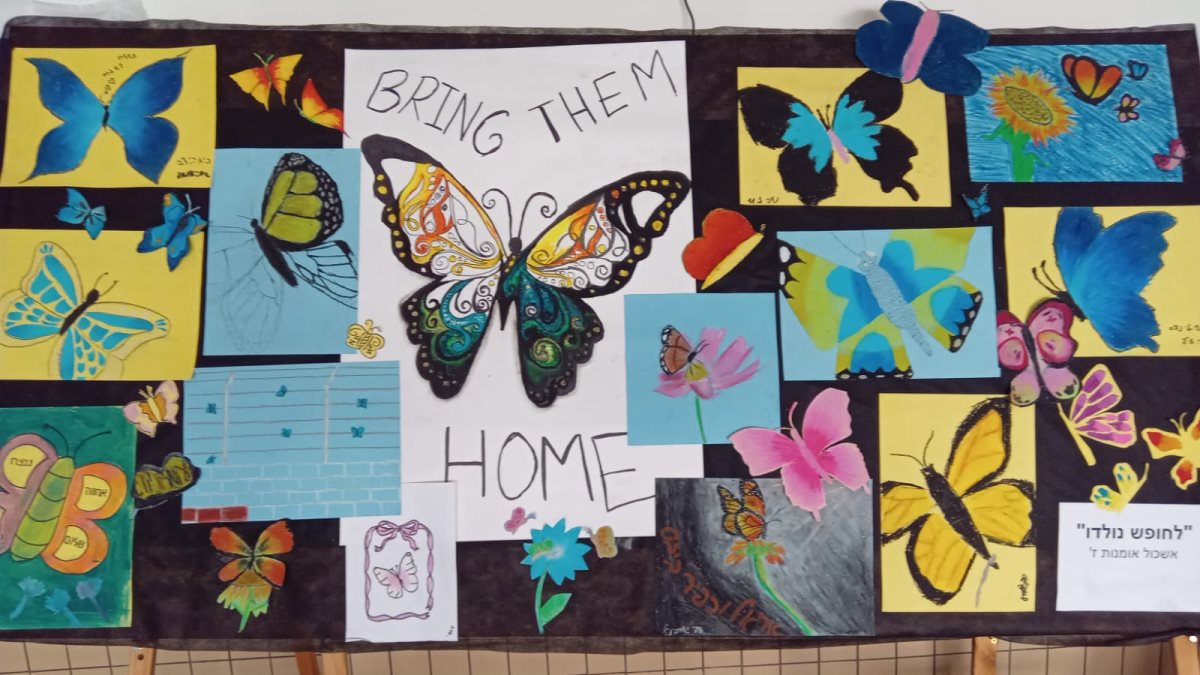 תלמידי שכבה ז' הכינו קולאז פרפרים עם הכיתוב bring them home ,