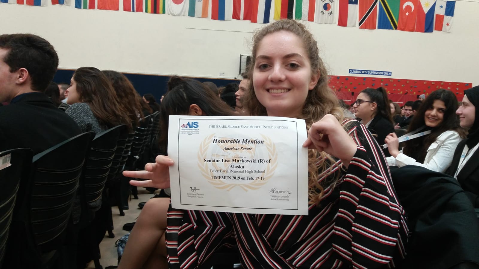 תלמידי תיכון באר-טוביה קיבלו אות הצטיינות בועידה הבינלאומית TIMEMUN