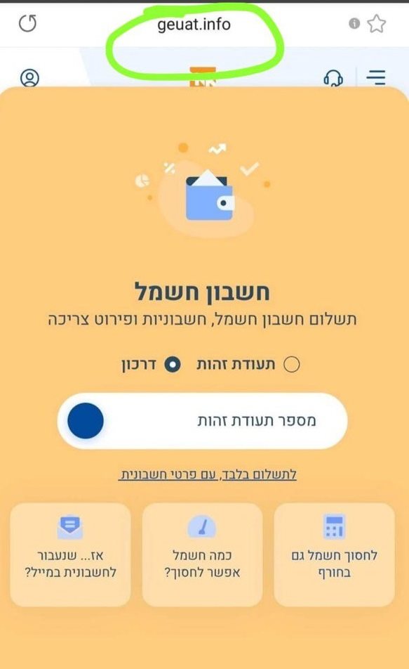 בימים האחרונים מופצות הודעות לנייד של הלקוחות - המבקשות מהלקוח להסדיר את חובו בחשבון בהקדם האפשרי, כולל קישור לאתר אינטרנט,כביכול מטעם מחלקת גביית חיובים של חברת החשמל. בלחיצה על הקישור הלקוח מתבקש להקיש תעודת זהות באתר אינטרנט הזהה בנראות לאתר הרשמי של חברת החשמל ומשם מתבקש למלא פרטי כרטיס אשראי.
