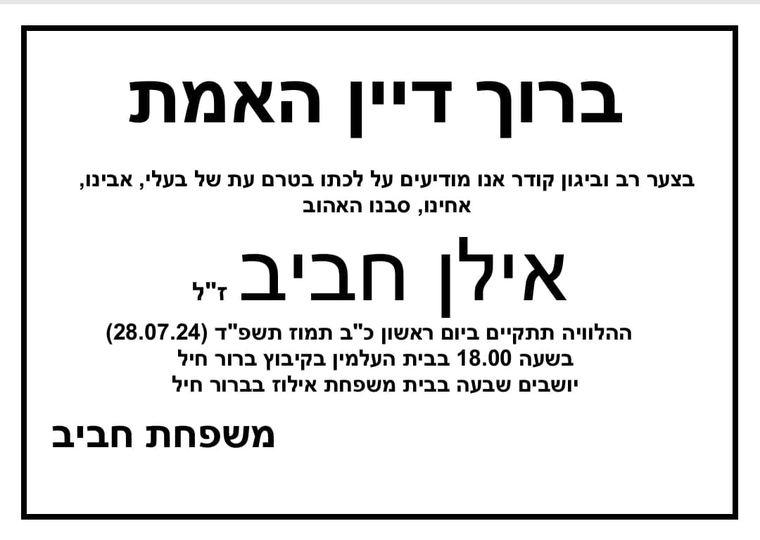 כאמור הוא נהרג אמש בתאונה ממש סמוך לביתו אשתו מאושפזת במצב קשה . אילן הוא הותיר אחריו את אשתו לני, שלושת ילדיו - לירן, קטיה ומידן - ונכדים. טרם פורסם מועד הלוויה. המרכז ההידרותרפי שער הנגב משתתף בצערה של משפחת חביב המורחבת, הקיבוצים ברור חיל ומפלסים וקהילת המתאמנים של ההידרו עם הידיעה על מותו של אילן לוי חביב, שנהרג הלילה בתאונת דרכים בכניסה קיבוץ מפלסים. אילן היה גימלאי של ההידרו ולו משפחה ענפה בשער הנגב. בשעה קשה זו אנחנו שולחים החלמה מהירה ללני אישתו וכוחות לילדים לירן, קטיה ומידן ולמשפחה כולה. חבריו סופדים לו בפייסבוק : עירית צדק : "לא ניתפס. אסון גדול. לא היה ביקום אדם זהיר ומחושב יותר מאילן חביב. אבא מסור . בעל מסור. אדם מיקצועי. לא ניתפס" - שולי הרן : אין מילים. העצב מכה. לא נזכה עוד לחיוך, לאמירה שכולה רק טוב. לא נתפס. לכל המשפחה אתכם בשעה קשה וכה כואבת." - יערה חזן : היה פשוט איש חביב!!! אילן החביב, איזה עצוב. יהי זכרו ברוך" -