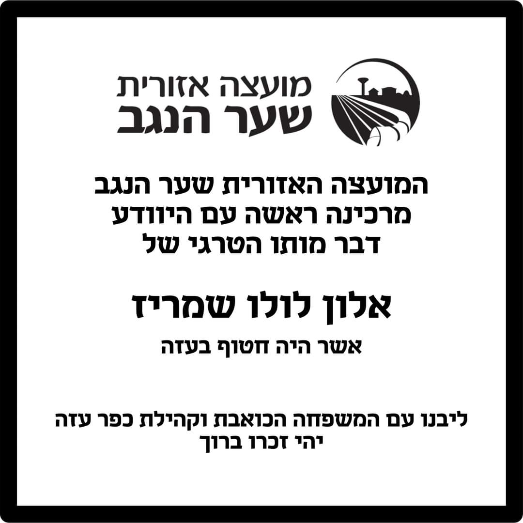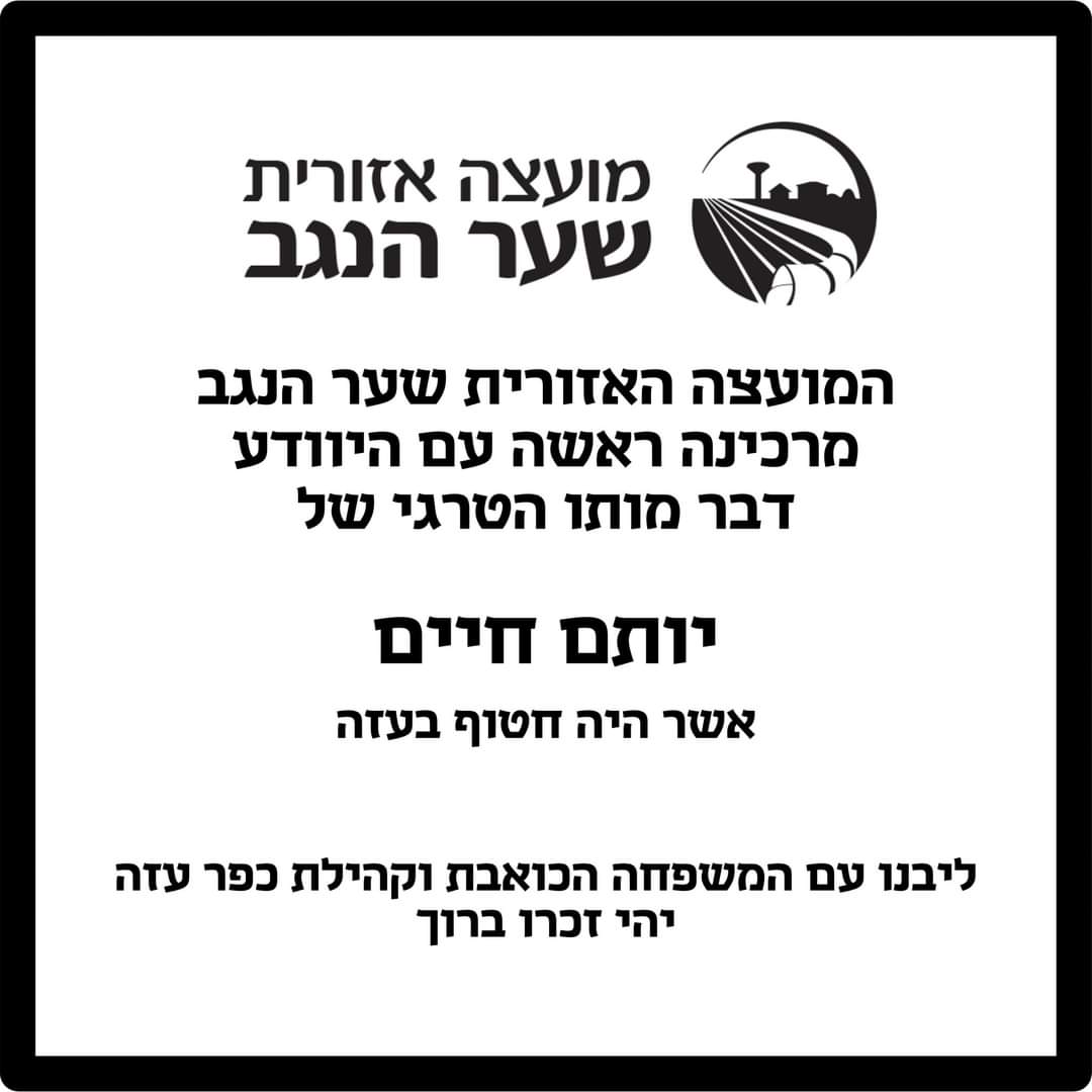 המועצה המומה וכואבת את מותם של יותם חיים אלון לולו שמריז מקיבוץ כפר עזה ואת מותו של סאמר טאללקה, עובד המדגרה של ניר עם שנורו בשוגג במהלך פעולה מבצעית בתוך רצועת עזה.