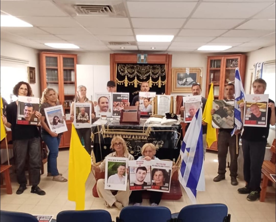 בעקבות מעצר הנשים שחילקו כרזות חטופים בבית כנסת בהרצליה, התכנסו היום בבית הכנסת של קיבוץ בארי כמה מחברי הקיבוץ בקריאה לשחרור החטופים. בין המצולמים בתמונה: תמי ברוך, אמו של סהר ברוך ז"ל שנרצח בשבי וגופתו עדיין מוחזקת בעזה, וקובי בן עמי, אחיו של אוהד בן עמי שחטוף בעזה כבר 349 ימים ולילות.