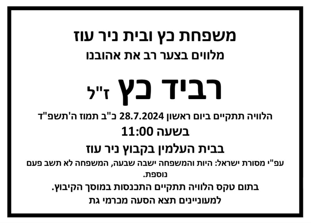 רביד, מתגעגעים ואוהבים נלווה יחד בצער רב את אהובנו רביד כץ ז״ל בלוויה שתתקיים ביום א׳, 28.7.2024, כ״ב בתמוז התשפ״ד בשעה 11:00 בבית העלמין בקיבוץ ניר עוז. היות והמשפחה ישבה שבעה, המשפחה לא תשב פעם נוספת. יהי זכרו ברוך.