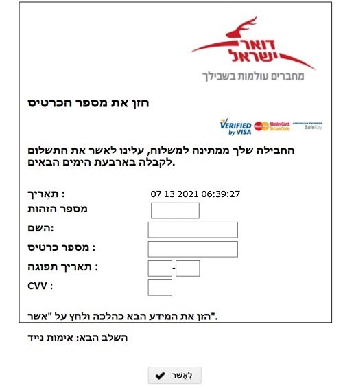הקורבן מתבקש למלא פרטים כמו תעודת זהות, מספר טלפון, שם, כתובת, מספר כרטיס, תאריך תפוגה ושלוש ספרות בגב הכרטיס.