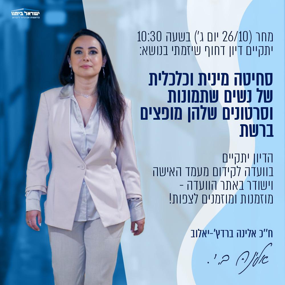 ח"כ אלינה ברדץ' יאלוב תקיים דיון מיוחד בכנסת בנושא סחיטה מינית של נשים ברשת