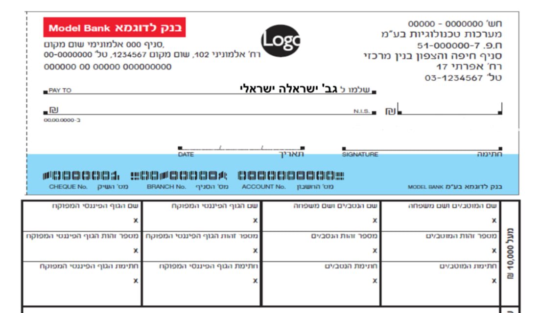 הטבלה תופיע רק על גבי צ'קים שלא הודפס עליהם מראש "קרוס" (הגבלת הצ'ק למוטב בלבד).