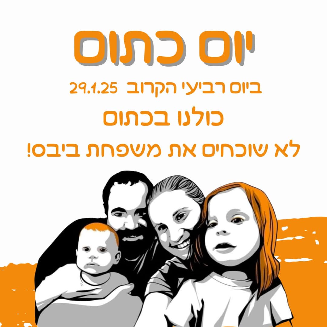 כולנו יחד עם משפחת ביבס, מחזיקים תקווה ומחכים לשובם. ממתינים לקבלת ודאות באשר למצבם ביום רביעי הקרוב 29.1.25 כל אזרחי ישראל ילבשו כתום למען שירי, ירדן, אריאל וכפיר!