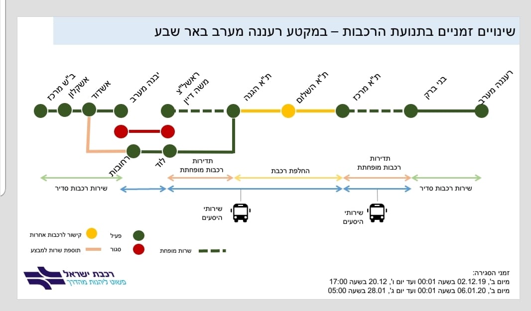 כיצד ישפיעו העבודות על הנוסעים מתחנת אשדוד? . מתן ברקוביץ, דובר רכבת ישראל, מציין כי לצד דילול בתנועת הרכבות בקו המערבי (מאשדוד דרך יבנה מערב, ראשל"צ ועד תל אביב), הקו המזרחי שנוסע ליבנה ועובר דרך לוד, יתוגבר משמעותית במהלך ימים אלה. . השינויים הזמניים יימשכו בתאריכים 2.12.19-20.12.19 וכן בין התאריכים 6.1.20-28.1.20. (בשבוע חג החנוכה ובשבוע הפסטיגל תופעל תנועת הרכבות כסדרה). . בימי העבודות, רכבות שמוצאן בתחנת באר שבע יסתיימו בתחנת יבנה מערב, ורכבות היוצאות מתחנות ראשל"צ משה דיין יסתיימו בתחנת ת"א ההגנה. לא תתאפשר נסיעה ברכבת בין תחנות יבנה מערב לראשון לציון משה דיין. כל תחנות הקו תשארנה פתוחות לשירות, יתוגברו קווי רכבת חלופיים, ויופעל מערך היסעים חינמי כשירות משלים לתנועת הרכבות. . פירוט השינויים בקו באר שבע מרכז-ראשל"צ משה דיין- רעננה מערב: בשעות השיא (6:00-9:00 ו-15:30-19:00) מכיוון מדרום (תחנות מוצא באר שבע מרכז וראשל"צ משה דיין). . שתי הרכבות היוצאות מידי שעה מתחנת באר שבע מרכז לכיוון צפון תסיימנה את נסיעתן בתחנת יבנה מערב, ממנה יופעל מערך היסעים חינמי בין תחנת יבנה מערב לתחנת תל אביב ההגנה. . לחילופין, תתאפשר החלפת רכבות לכיוון צפון בתחנות אשקלון או אשדוד. . שתי הרכבות היוצאות מדי שעה מתחנת ראשל"צ משה דיין תסיימנה את נסיעתן בתחנת ת"א ההגנה. נוסעים לתחנות צפוניות מתחנת ההגנה יבצעו החלפת רכבות בתחנה זו או יעזרו בשירותי ההיסעים החינמיים שיוצבו בה. . בשעות השפל (9:00-15:30 ו-19:00-6:00) מכיוון דרום (תחנות מוצא באר שבע מרכז ואשקלון). . הרכבת היוצאת מידי שעה מתחנת באר שבע מרכז, והרכבת היוצאת מידי שעה מתחנת אשקלון צפונה, תסיימנה נסיעתן בתחנת ת"א ההגנה. בתחנת ת"א ההגנה תתאפשר החלפת רכבות לכיוון צפון ודרום. . דגשים מיוחדים לנוסעים בימים אלה: יופעל מערך היסעים חינמי כתגבור לתנועת הרכבות. במהלך ימי חג החנוכה תופעל תנועת הרכבות כסדרה. על מנת שנוכל להמשיך ולספק שירות איכותי ומהיר, נוסעים עם מוגבלויות מתבקשים להקפיד על תיאום נסיעה בתוך 12 שעות ממועד הנסיעה המבוקשת. רכבות הלילה בקו הנגב המערבי בין תחנות ת"א ההגנה ובאר שבע יופעלו כסדרן במהלך ימי העבודות. . לנוסעי הרכבת מומלץ להתעדכן בפרטים המלאים באתר רכבת ישראל, ביישומון ובמוקד שירות הלקוחות שמספרו *5770. . נוסעים המעוניינים להציע הצעות לייעול מוזמנים ליצור קשר עם מוקד שירות הלקוחות הטלפוני שמספרו *5770. .,