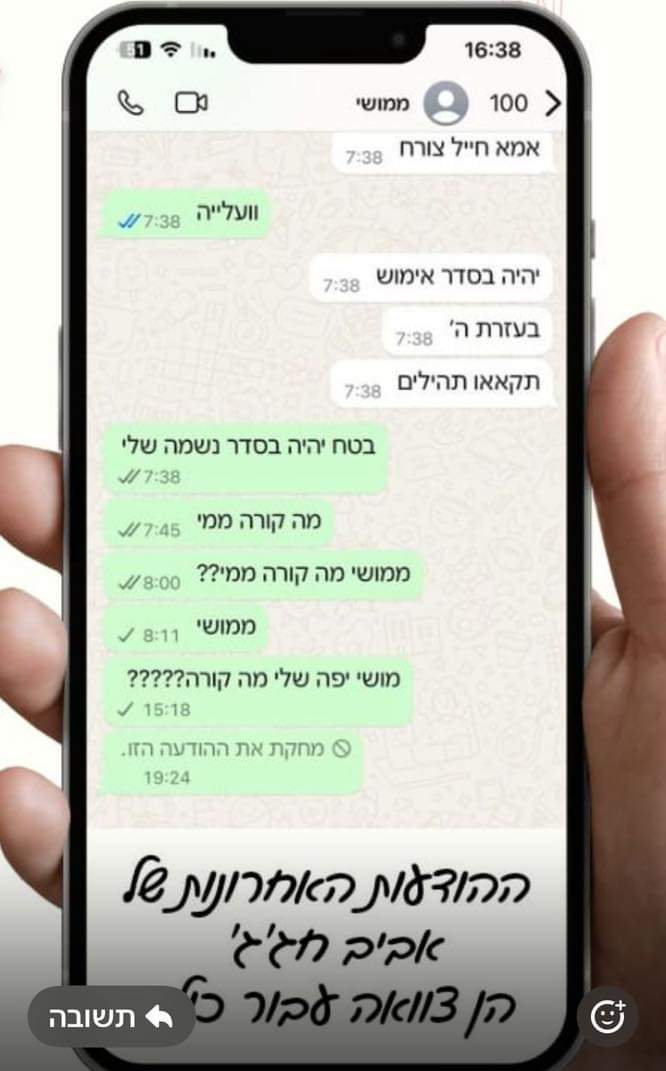 ביום ראשון, 29.9.24 באזכרת השנה לאביב מרגלית חג'ג' ז"ל, המשפחה מבקשת לכבד את זכרה על ידי קיום צוואתה האחרונה – קריאת תהילים. אביב, במסירות נפש, ביקשה תפילה לפני שנפלה בקרב, והמשפחה מבקשים מהציבור להצטרף במרתון קריאת תהילים ביום האזכרה. "יחד, נקרע שערי שמים לזכרה ולזכר כל הנופלים, למען אחדות עם ישראל, הצלחת חיילינו והשבת החטופים בשלום".