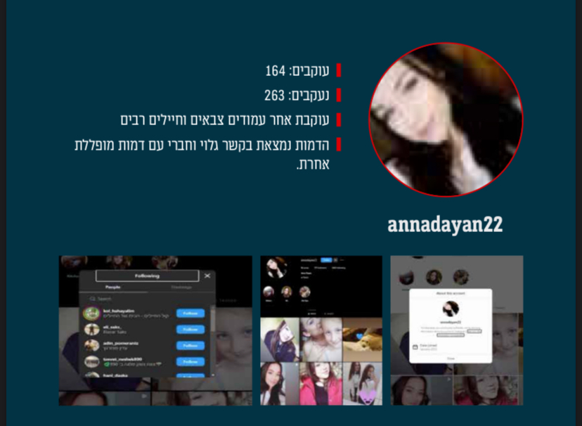 מעקב אחר חיילים ברשתות החברתיות הינה אחת משיטות האויב להעשרת המודיעין. משרתי צה״ל וכלל הציבור מתבקשים לגלות עירנות מירבית בנושא ולהמשיך לדווח לגורמי המקצוע השונים על דמויות חשודות שמופיעות ברשתות הדיגיטל השונות ולנקוט בצעדי הגנה על הפרטיות ברשת. רשימת הפרופילים הפיקטיביים - בדקו שאינם בין העוקבים שלכם באינסטגרם וחיסמו אותם מיד: