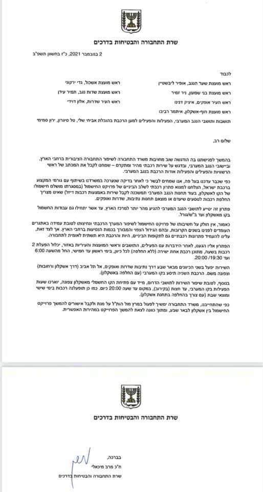 אחרי המאבק העיקש של ראשי הרשויות הדרום בבקשה למשרד התחבורה לא לבטל את הרכבות מיישובי הדרום למרכז, אתמול הצליחו לגבש הסכם בו הרכבות הישירות תימשכנה גם בתקופת החשמול, אחת בכל שעה בשני הכיוונים . בנוסף, תוגדל תדירות הרכבת וכל שעה יצאו שתי רכבות במקום אחת, יתווספו תחנות בחיבור, כמו רחובות, נתניה והרצליה ורכבות הלילה וסופי שבוע יחזרו בקרוב, מיד עם סיום עבודות החשמול