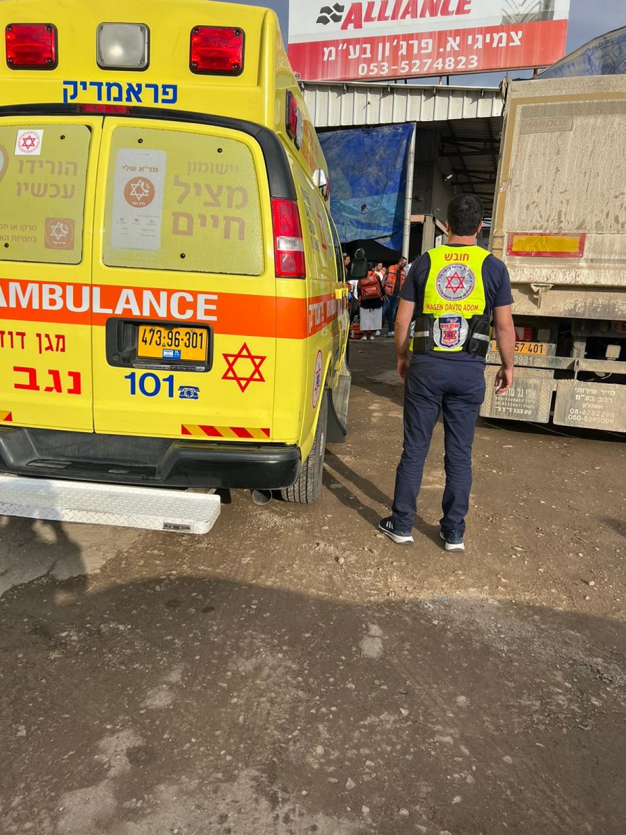 חובש רפואת חירום רכוב על אופנוע מד"א מעוז ויברמן סיפר: "כשהגענו למקום ראינו גבר שוכב בסמוך למשאית כשהוא מחוסר הכרה לאחר שנפגע במהלך עבודתו מחפץ כבד. הוא היה עם פגיעות קשות בפלג גופו העליון ולאחר בדיקות רפואיות לא נותר לנו אלא לקבוע את מותו במקום."