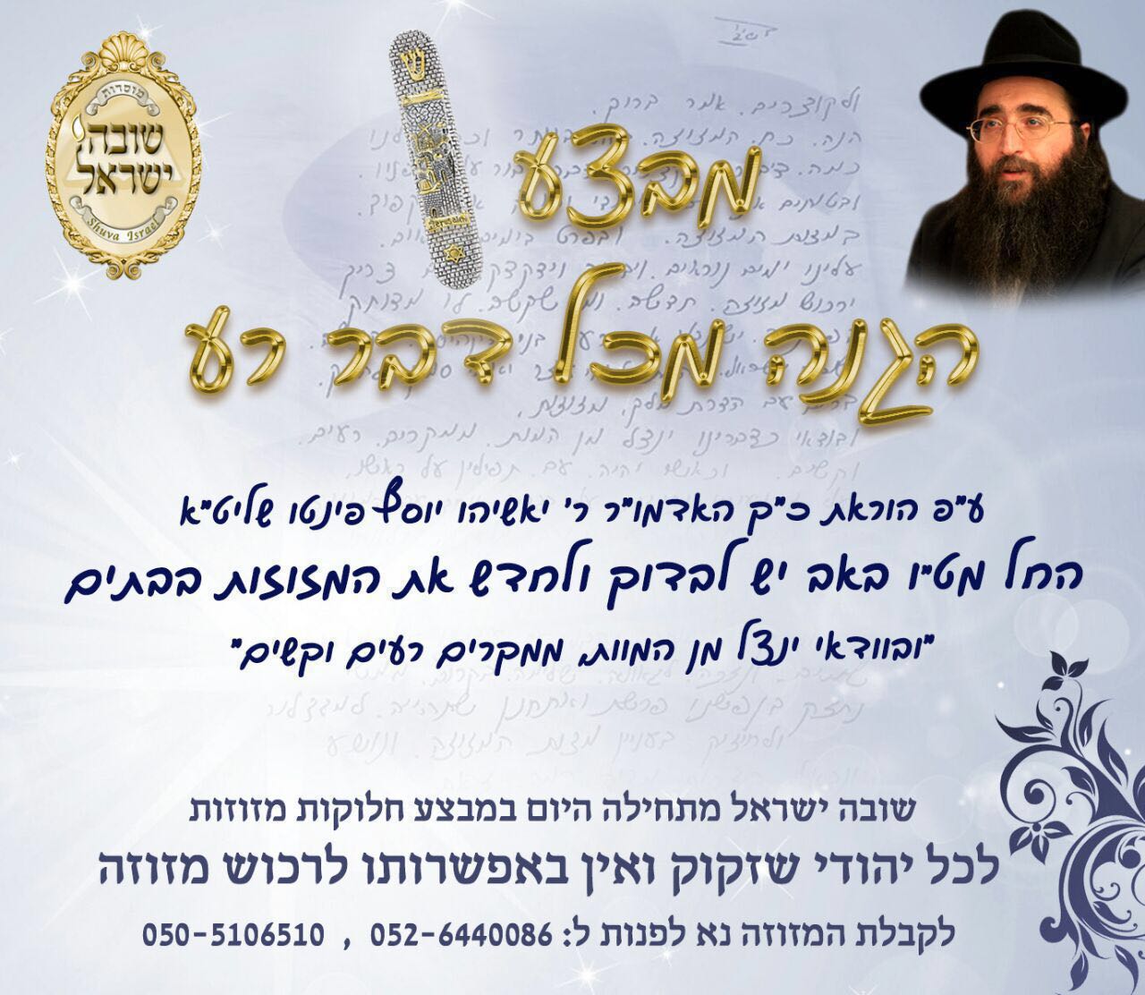 ע"פ הוראת האדמו"ר רבי יאשיהו יוסף פינטו שליט"א החל מט"ו באב יש לבדוק ולחדש את המזוזות בבתים "ובוודאי ינצל מן המוות ממקרים רעים וקשים" שובה ישראל מתחילה היום ט"ו באב במבצע חלוקת מזוזות לכל יהודי שזקוק ואין באפשרותו לרכוש מזוזה לפנות לטלפון 0525106510