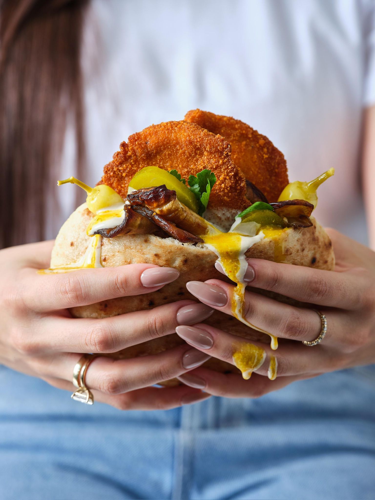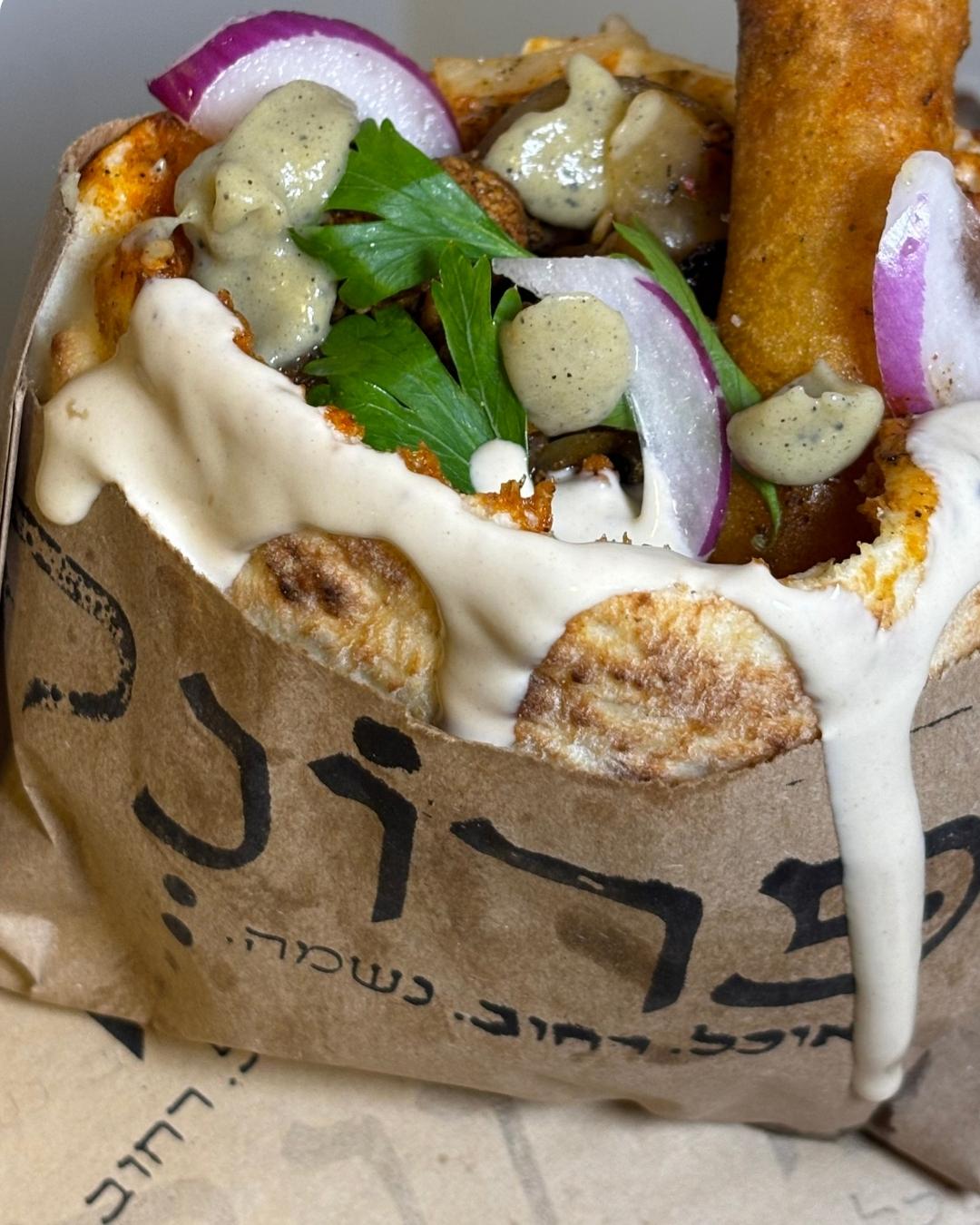 - פיתה צמחונית – חציל, פטריות יער, רוקט, בצל מטוגן, טחינה ופסטו כוסברה.