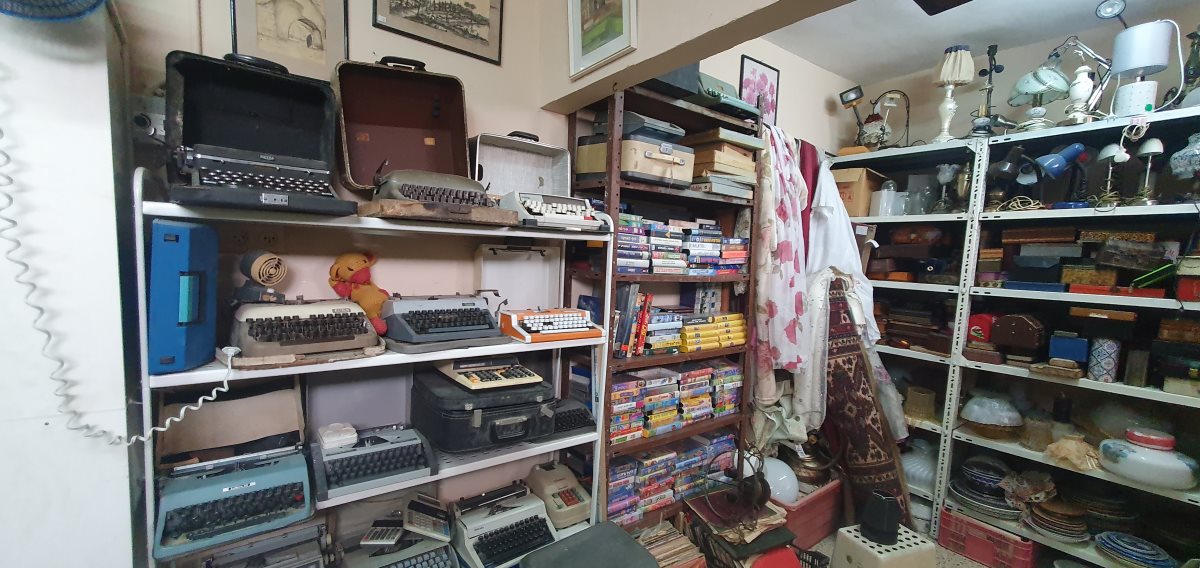 המשכנו למכונת כתיבה ישנה, ראינו משקל פירות וירקות עתיק, מכונת תקליטים עם מבחר עצום של תקליטים מיושנים, ואפילו גרמופון מפואר שהיה מונח על גבי שולחן עץ, מטחנת קפה, ואף מכונת תפירה "זינגר" כמו שהיה בבית הורי .
