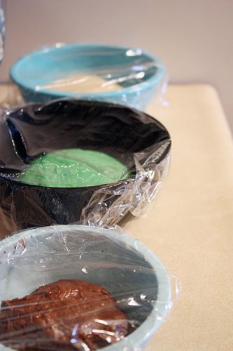 8. נקו את קערת המיקסר, והניחו בה את כדור הבצק הקטן ביותר. ערבבו את כדור הבצק עם אבקת הקקאו עד לקבלת הצבע הרצוי. הניחו את הבצק הצבוע בקערה משומנת ומכוסה, והניחו