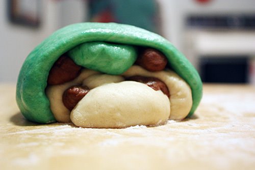 14. חלקו את הבצק הירוק לשני כדורים, אחד כפול בגודלו מהשני. את החלק הקטן גלגלו והניחו בין שתי האוזניים, ואת החתיכה הגדולה מתחו, ועטפו בעזרתה את כל הבצק.
