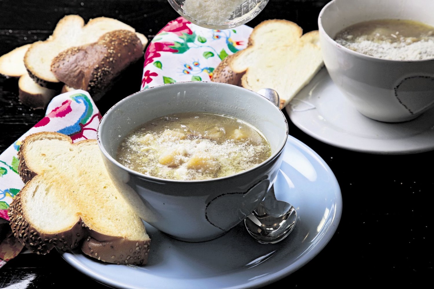 תוך זמן קצר הסתדר מרק בצל לתפארת, בנוסח משלי - חריף עם שום. הצרפתים אולי היו מכווצים מעט את הגבות באכזבה, אבל לדעתי יצא נפלא, כולל טוסטים מהחלה הנהדרת שלא הספקנו להגיע אליה בחג, שהתאימו בדיוק לחגיגת פתיחת עונת המרקים.