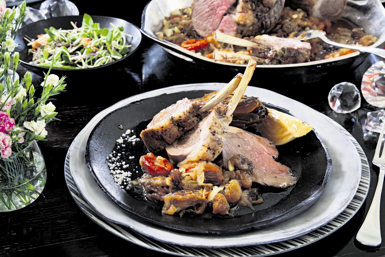 מרק שורשים ירוק, סלט נבטים צעירים עם סלמון, שוק וצלעות טלה בתנור מוגשים עם טנזיה וירקות אביב פריכים. וטראפלס תמרים. פיני מבשל ארוחה חגיגית במיוחד