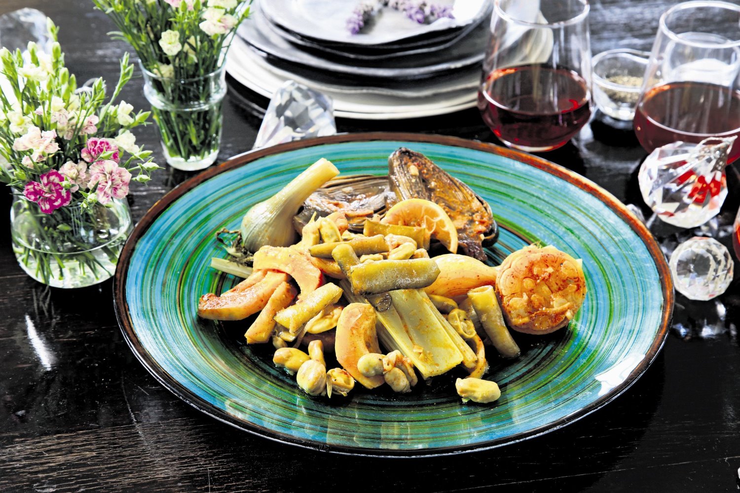 השנה החלטתי על קונספט קצת שונה. המרכיבים הם אותם מרכיבים מהמסורת: ארטישוק, סלרי, פול ירוק, דגים, בשר כבש ותמרים, אבל החלטתי לעלות מדרגה. הפעם החלטתי שלא להתפתות ולבשל את כל המרכיבים בסיר אחד, אלא הפרדתי ביניהם. וכך, מה שהיה נכנס לסירים נפרדים והתבשל בנפרד. זה שומר על כל הטעמים של כל אחד מהמרכיבים, מאפשר שליטה בהם, ובהגשה נראה הרבה יותר אסתטי. עוד עניין חשוב שאסור לחפף בו: עדיף להכין ציר מרק עוף טוב לפני הבישול ולהשתמש בו בכל המתכונים במקום במים חמים.