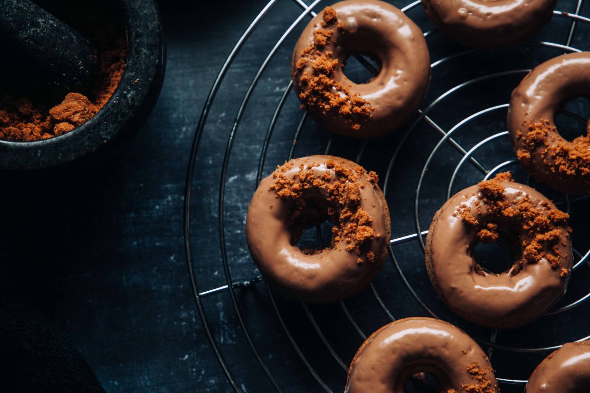 לאחר הקירור, הוציאו את הדונאטס מהתבנית, צפו כל יחידה בשוקולד ופזרו מלמעלה פירורי ביסקוויטים לקישוט.