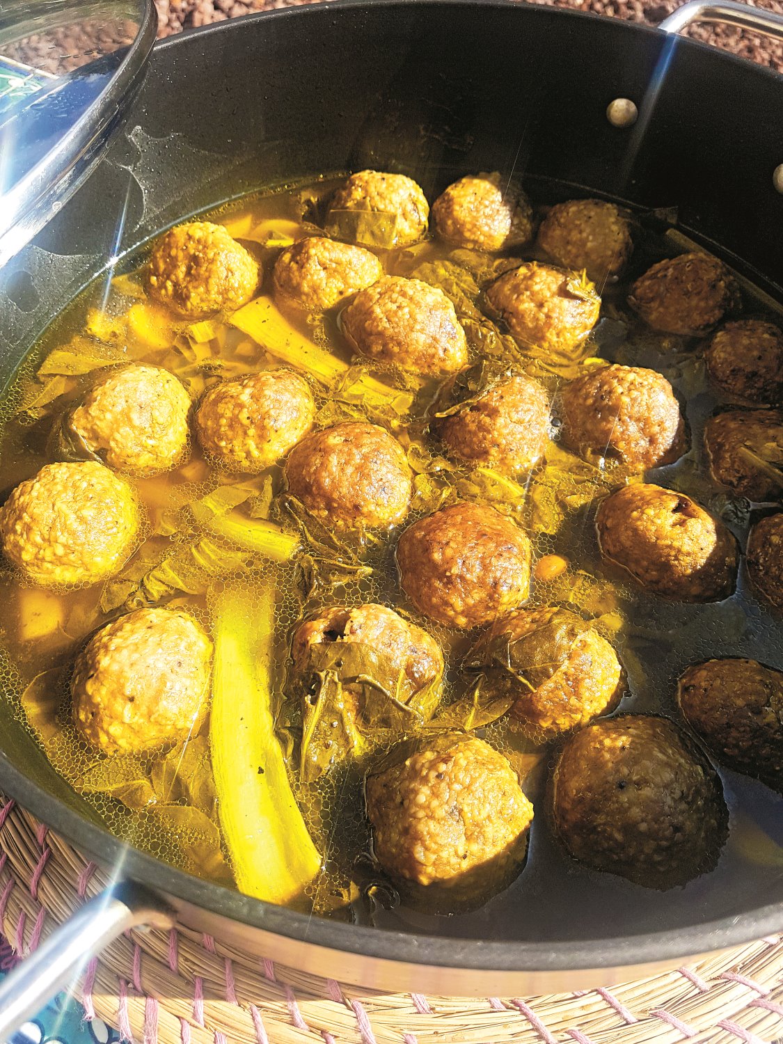 כדורים מבשר טחון, בקמח חומוס קלוי, עם מילוי צנוברים וברוטב חמצמץ. פיני מרגיע את האווירה עם סיר שכולו תאווה לעיניים ולחך