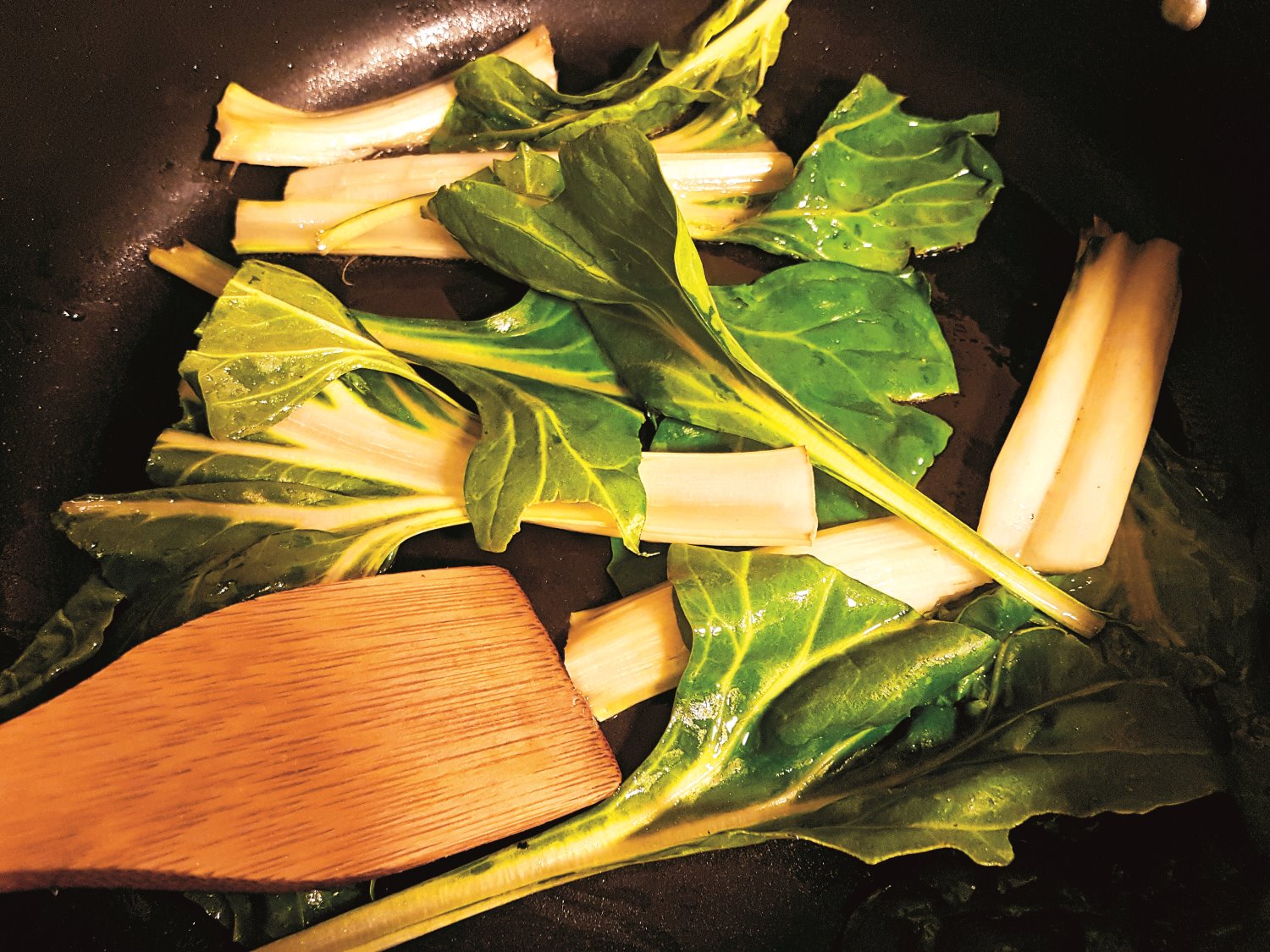 עוברים להכנת הרוטב. בסיר שטוח מחממים מעט שמן, מוסיפים את גבעולי המנגולד ומטגנים כחמש דקות.