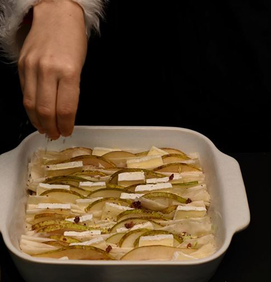 שוטפים ופורסים את האגסים הלא קלופים לפרוסות דקות, וחוצים כל פרוסה לחצי. פורסים גם את גבינת הברי, וקוצצים את הפיסטוקים והחמוציות לפירורים בינוניים-קטנים.