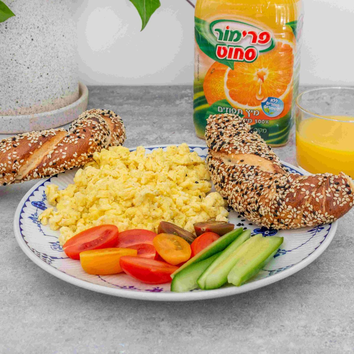 מלח ופלפל שחור לפי הטעם מעט שמן לטיגון להגשה: בייגל / טוסטים / לחם / לחמניות מיץ תפוזים סחוט טרי של פרימור ירקות טריים חתוכים אופן ההכנה: - שוברים את הביצים לקערה, מוסיפים את מיץ התפוזים וטורפים היטב.