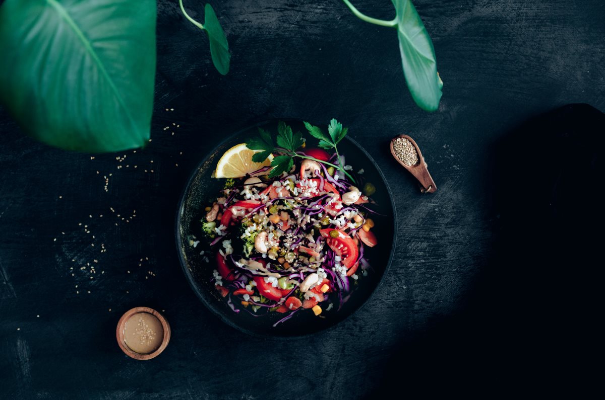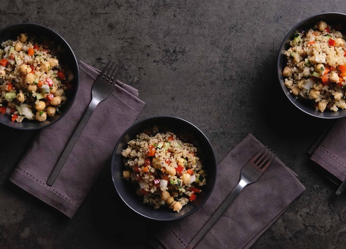 סלט צבעוני עם רוטב בוטנים, סלט פסטה קייצי וסלט קינואה הם אופציה טובה היא לסלטים מושקעים, שיהווה אפשרות משביעה גם לצמחוניים ולטבעוניים בשולחן