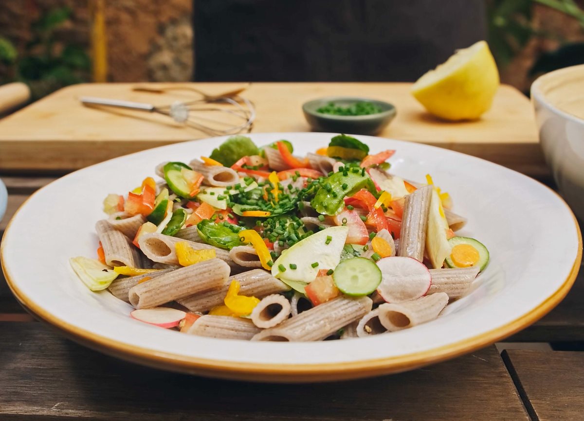 מביאים לרתיחה מים עם מלח ומבשלים פסטה. מסננים ומצננים במים קרים. שוטפים וחותכים את כל הירקות, מסירים את זרעי העגבניות ושומרים אותם בצד. מוסיפים ירקות לפסטה. על מנת להכין את הרוטב, מרסקים את זרעי העגבניות במסננת לקבלת המיץ. מערבבים את מיץ עגבניות עם השמן, פלפל ומיץ מחצי לימון, מקציפים ויוצקים על סלט הפסטה.