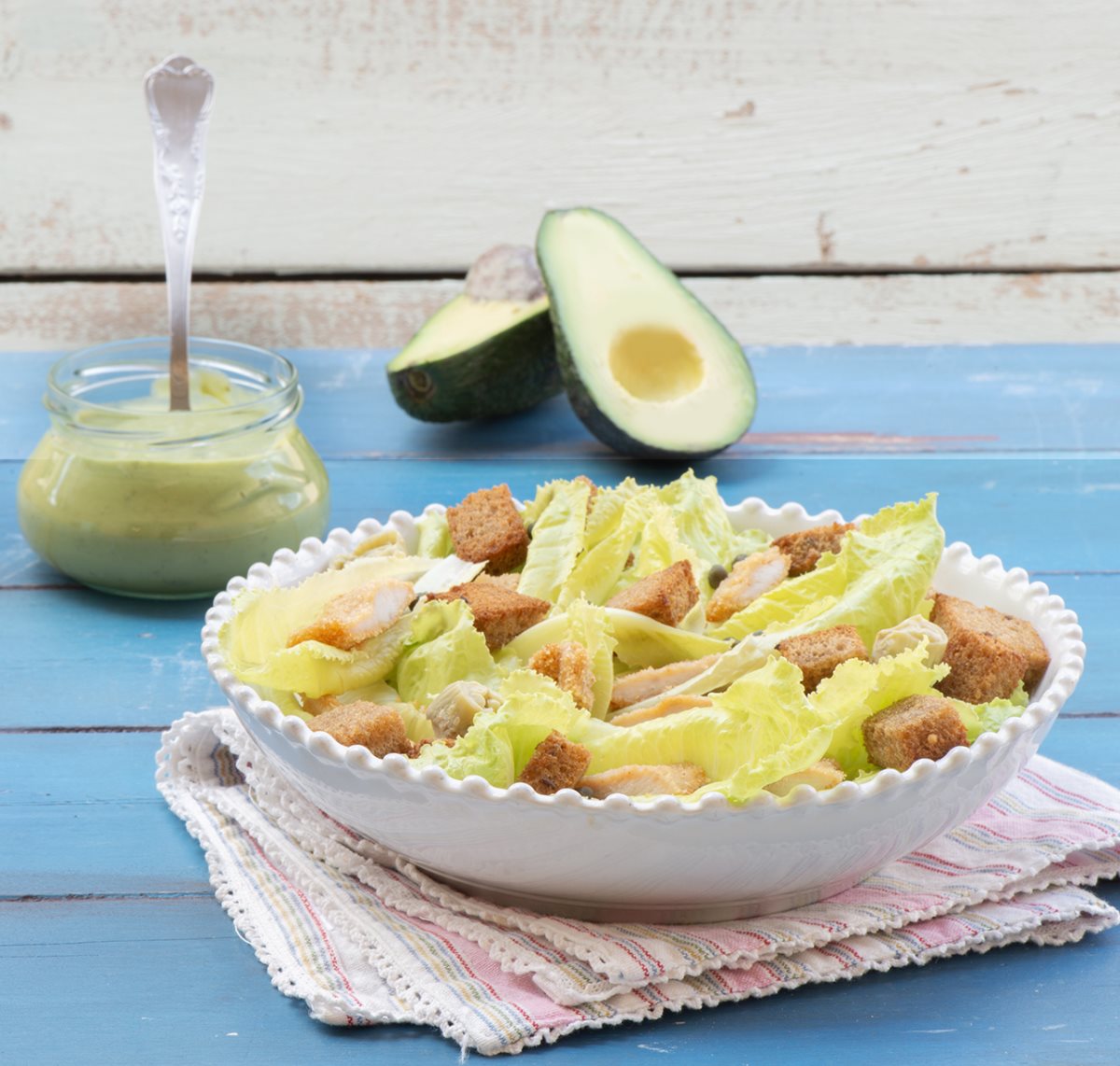 סלט קיסר עם רוטב אבוקדו וקרוטונים
