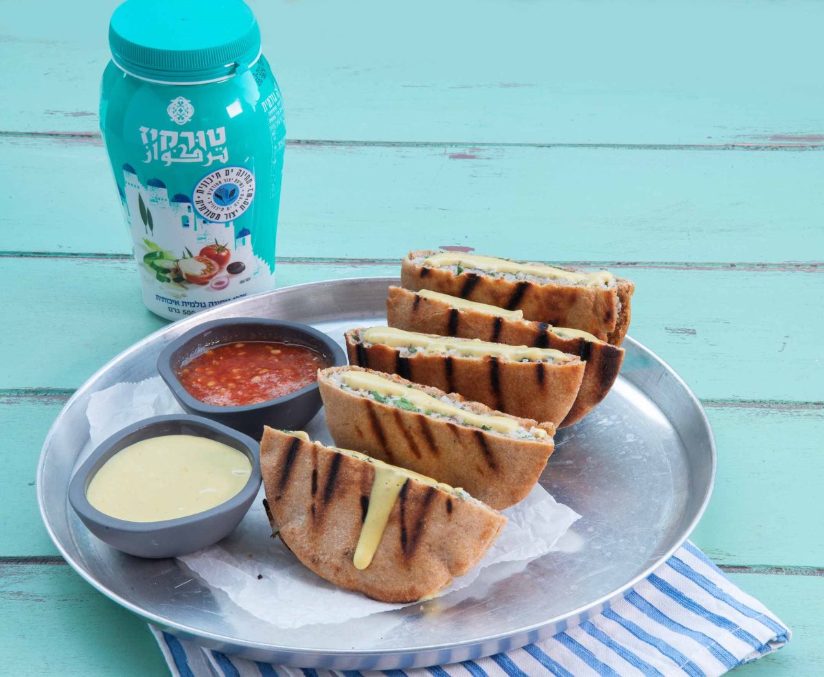 - מחממים תנור ל-200 מעלות. ממלאים את חצאי הפיתות בתערובת הדגים ומושחים אותן בשמן זית.