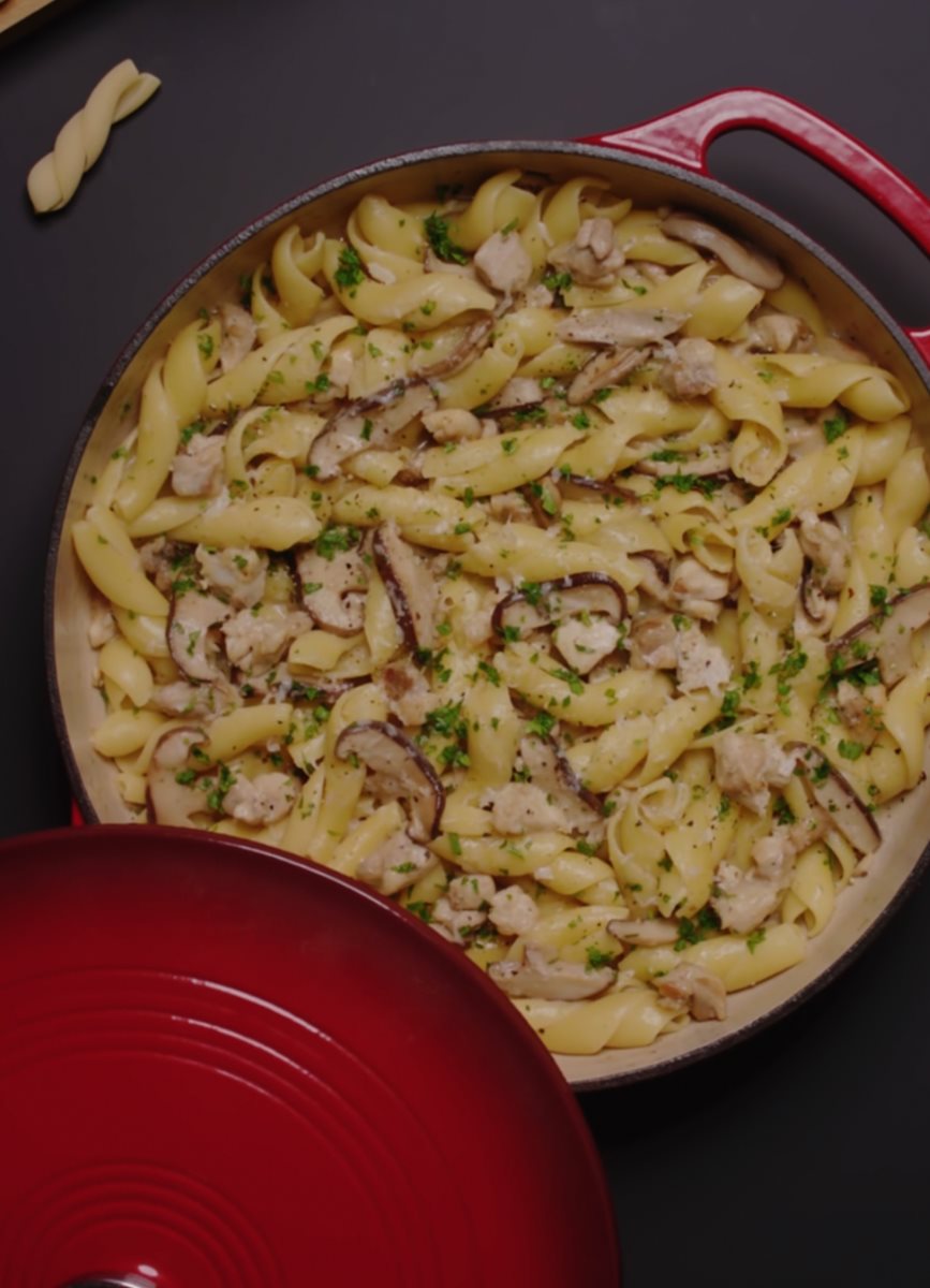 - 4 ירכי עוף ללא עצמות - 2 בצלי שאלוט - שן שום אחת - 200 גרם שיטאקי - 250 גרם פסטה - 130 מ"ל יין לבן - מלח - פלפל - 1 ליטר ציר עוף או ירקות - גבינת פרמז'ן טבעונית - פטרוזיליה הוראות הכנה: קוצצים את השום והשאלוט דק, פורסים את הפטריות וחותכים את העוף לקוביות. מחממים את שמן הזית במחבת ומטגנים תוך ערבוב את השום והשאלוט עד להזהבה. לאחר מכן מוסיפים את הפטריות ומבשלים עד שהשוליים מזהיבים. יוצקים יין לבן ומצמצמים. בינתיים, מחממים שמן על אש גבוהה במחבת פסים ומטגנים את העוף קלות כשהמחבת חמה מאוד. מניחים את העוף בצד. כשהפטריות מוכנות, מוסיפים 1/3 מהציר שלהן לפסטה ומערבבים ממש כמו שמכינים ריזוטו. כשהנוזל מתאדה כמעט לגמרי, מוסיפים עוד 1/3 ממנו לפסטה וחוזרים על הפעולה עד שהציר נספג לגמרי. כשנותרו חמש דקות לבישול הפסטה, מוסיפים את העוף ומערבבים, וממשיכים בבישול עד שהעוף והפסטה מוכנים. מכבים את האש, מפזרים גבינת פרמז'ן טבעונית מלמעלה לפי הטעם ומערבבים עד לאיחוד הרוטב. מקשטים בפטרוזיליה קצוצה ומגישים.