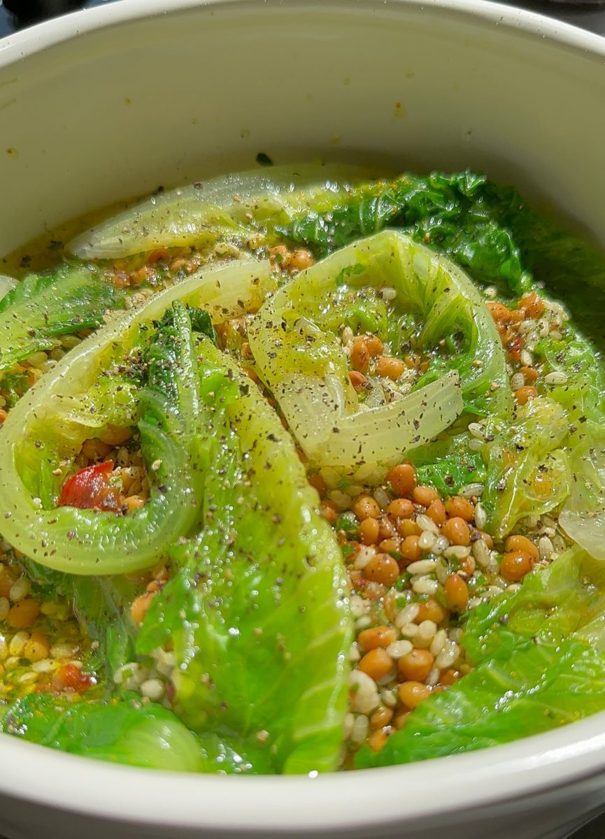- בסיר קדירה או בסיר מיועד לתנור נרכיב את המנה: נזלף 2 כפות שמן זית, נסדר את פרוסות תפוחי האדמה בתחתית, נשפוך מעל את תערובת האורז והעדשים ובין לבין נניח את עלי החסה. נניח מעל עלי חסה נוספים לעיטור ונפזר פלפל שחור גרוס.
