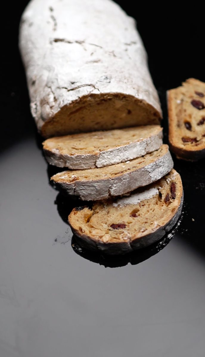 250 מ"ל חלב חם 3 כוסות קמח למילוי: 100 גרם חמוציות מיובשות 100 גרם צימוקים 100 גרם אפרסקים מיובשים ½ אגוז מוסקט מגורר 1 כפית קינמון 100 מ"ל מיץ תפוזים לבצק: 120 גרם חמאה 3 ביצים ½ כפית מלח 125 מ"ל חלב 180 גרם שקדים פרוסים 150 גרם סוכר 5 כוסות קמח לקישוט: אבקת סוכר 1. ממיסים את השמרים והסוכר בחלב החם. מניחים אותו בקערת ערבוב עם 3 כוסות הקמח ולשים עד לקבלת בצק. מניחים לבצק לנוח, מכוסה, במקום חמים למשך 30 דקות. הבצק יהיה גמיש יותר לאחר מכן. 2. למילוי: בסיר מערבבים את כל חומרי המלית עם מיץ התפוזים, מחממים עד לצמצום המיץ ונותנים לו להתקרר בכלי שטוח. 3. כשחלפו 30 דקות מוסיפים את החמאה לבצק וממשיכים ללוש. לאחר שהחמאה נטמעת, יוצקים פנימה את הביצים אחת אחת, את המלח, החלב, השקדים והסוכר. 4. לשים עוד 2-3 דקות ומוסיפים בהדרגה את יתרת הקמח (5 כוסות). לשים את הבצק עוד 10 דקות, עד שהבצק הופך לגמיש. 5. מוסיפים את המילוי ולשים פעם אחרונה עוד 5 דקות כדי שיתפזר היטב בכל הבצק. 6. מחלקים את הבצק לשניים, יוצרים 2 כדורים ומשטחים לגמרי בעזרת מערוך. כשהם שטוחים, מגלגלים כל יריעת בצק ונותנים לה לנוח 45 דקות על תבנית האפייה כשהצד המקופל כלפי מטה. 7. מחממים את התנור ל-190 מעלות ואופים במשך שעה. מצננים על רשת ומקשטים באבקת סוכר מעל.