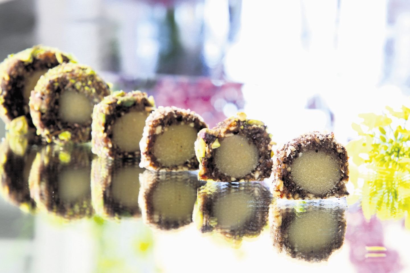 מגלגלים כדורי מרציפן קטנים ועוטפים כל עיגול במעט מתערובת התמרים. זה די פשוט ומסתדר היטב, כי העיסה נוחה לעבודה (אפשר להרטיב קלות את הידיים). מצפים כל עיגול בשברי הפיסטוק. בהגשה אפשר לחצות כל עיגול לשניים. שומרים במקרר בקופסה סגורה ונהנים מכל ביס - קינוח בריאות משובח לכל השנה.